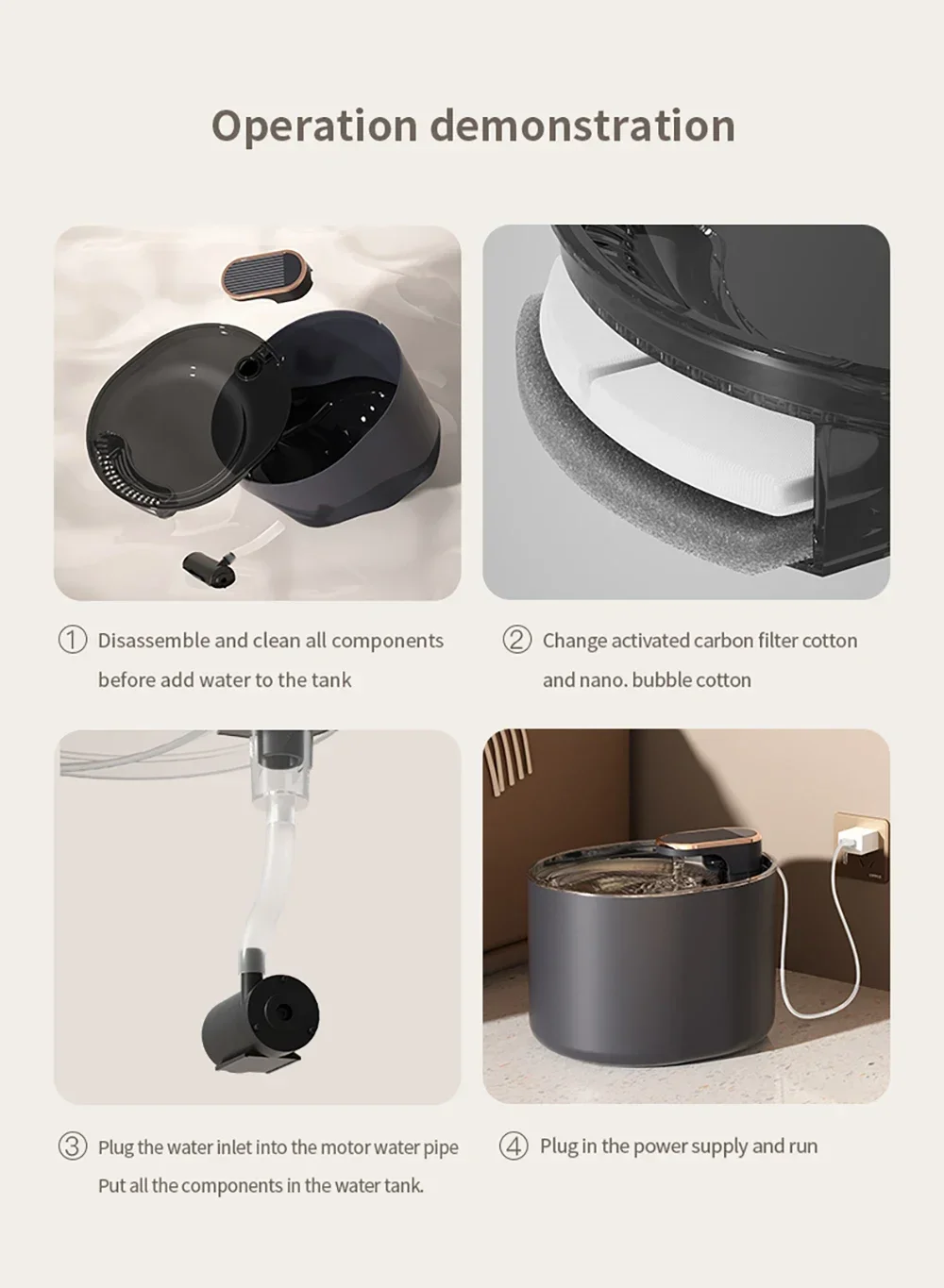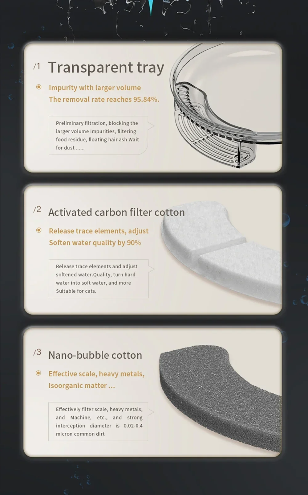 The four-layer filter refreshes fluid by its circulating system which follows the required standard keeps pets away from gastrointestinal diseases:improve the taste of the water,demineralizing the water to reduce the risk, and blocking large particles and large diameter pollutants, etc.