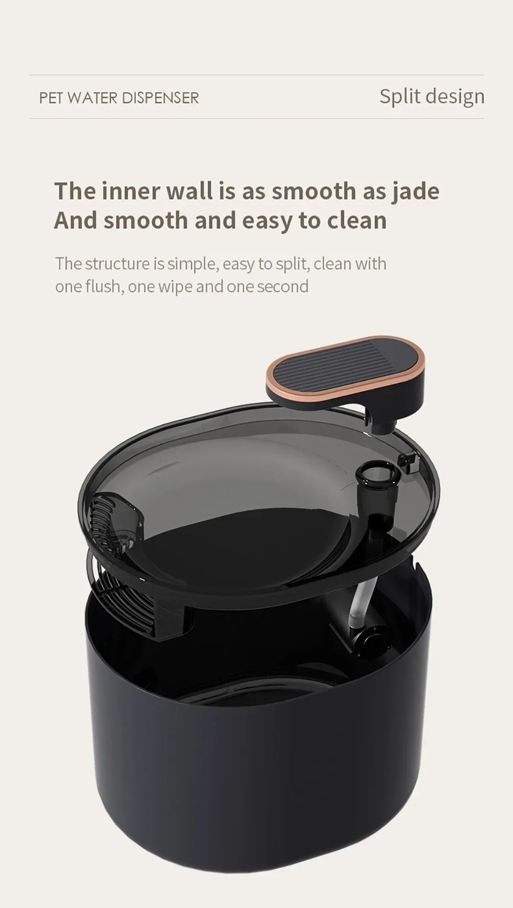 Two outlets flowing in mode, one is with trickle flow, and one is like spring flow, mimics the natural running water stimulates pets to get close and enjoy the peace of drinking.